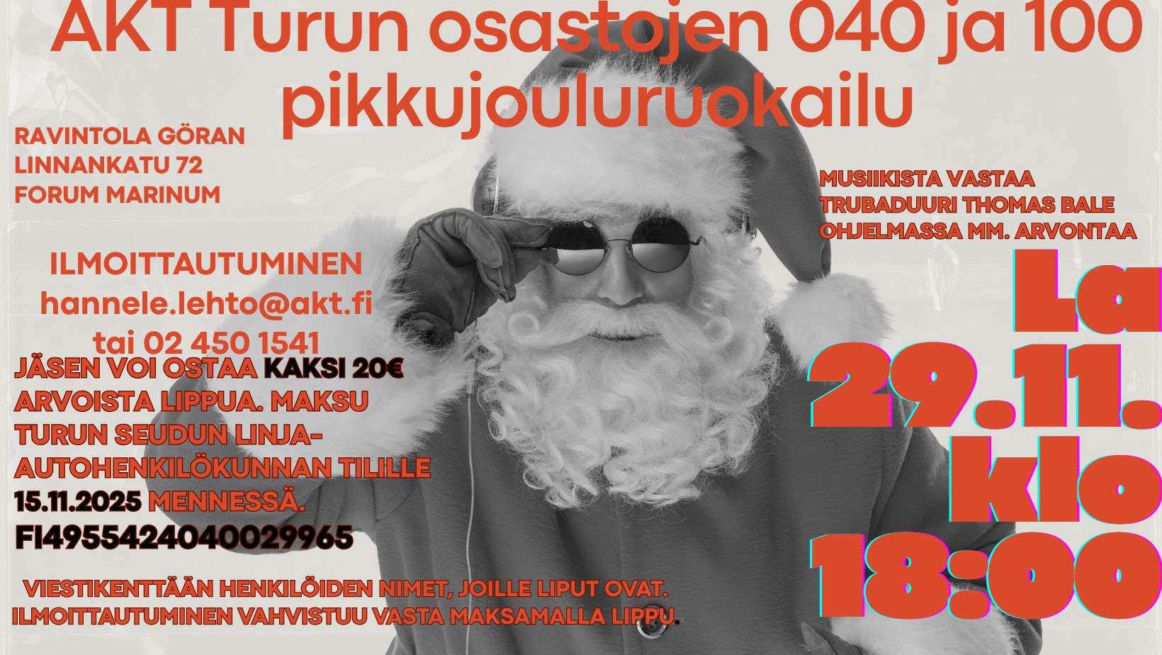 La 29.11.2025 klo 18.00 Ravintola Göran Linnankatu 72/ Forum Marinum Runsaan joulupöydän antimien lisäksi ohjelmassa mm. arpajaiset. Musiikista vastaa trubaduuri Thomas Bale. Liput a 20 €/ jäsen voi ostaa 2 lippua. Ilmoittautuminen hannele.lehto(at)akt.fi tai 02 450 1541 Maksa lippusi Turun Seudun Linja-autohenkilökunnan tilille: FI49 5542 40400 29965 viimeistään 15.11 mennessä. Viestikenttään henkilöiden nimet, joille liput ovat. Ilmoittautuminen vahvistuu vasta maksamalla lippu. Liitteet