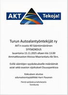 Turun Autoalantyöntekijät ry:n sääntömääräinen syyskokous ammattiosaston kokoustiloissa Maariankatu 6 b 5krs klo 13:00 alkaen. Esillä sääntöjen määräämät asiat ja osaston sijoitukset Osuuspankissa. Kokouksen alustaa edunvalvontapäällikkö Harri Pasanen. Tarjolla pientä syötävää ja kahvitarjoilu. Tervetuloa! Toimikunta Liitteet